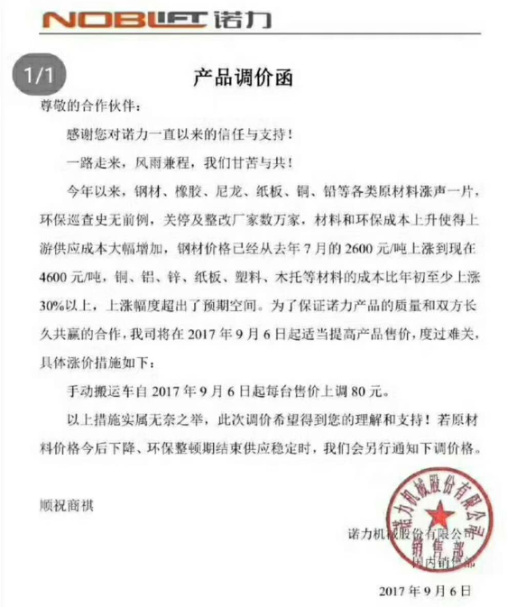 诺力产品调价函